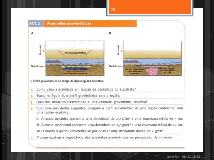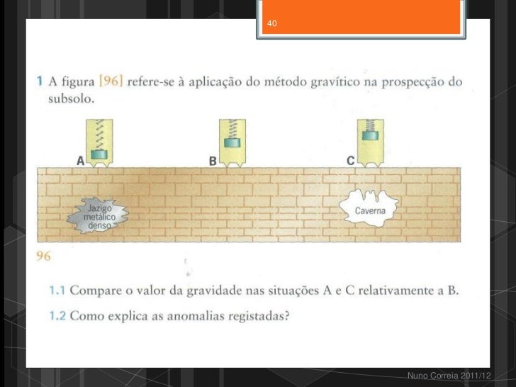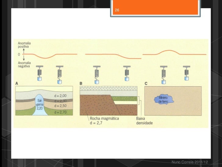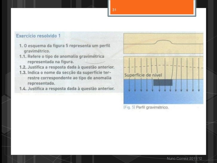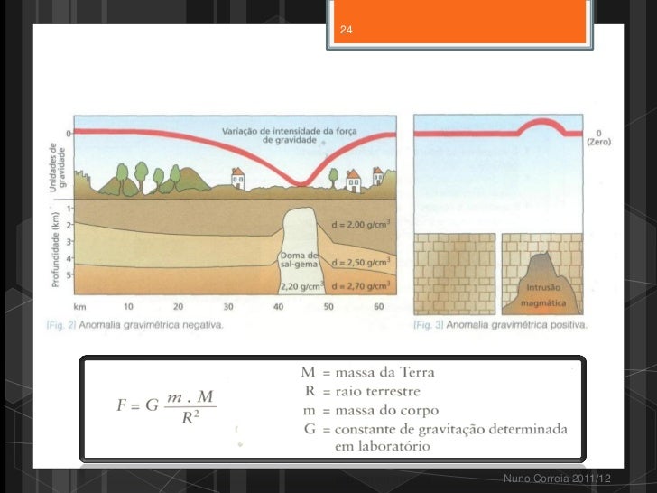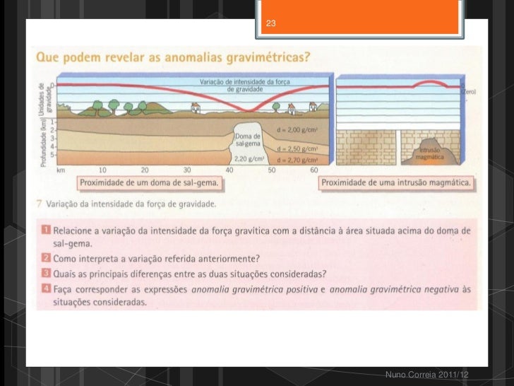 22. 22. 22 GravimetriaConvencionou-se que o nível médio das águas do mar possui uma força gravítica igual a zero  F = 0  Acima de zero – anomalia positiva  Abaixo de zero – anomalia negativa Nuno Correia 2011/12
