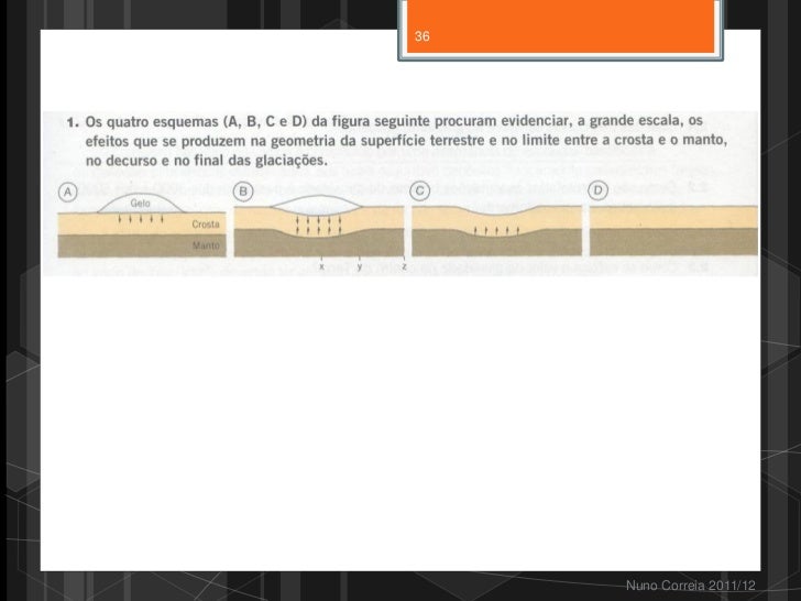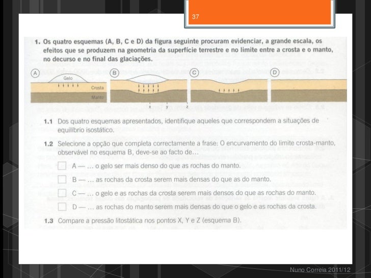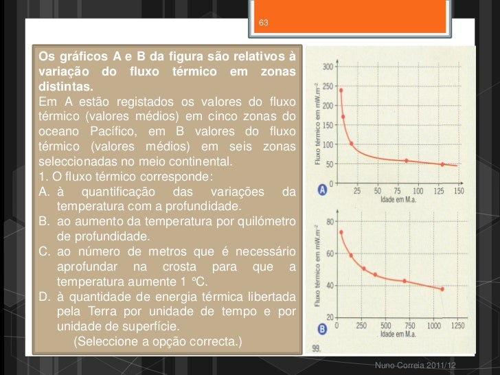 63. 63. 63Os gráficos A e B da figura são relativos àvariação do fluxo térmico em zonasdistintas.Em A estão registados os valores do fluxotérmico (valores médios) em cinco zonas dooceano Pacífico, em B valores do fluxotérmico (valores médios) em seis zonasseleccionadas no meio continental.1. O fluxo térmico corresponde:A. à quantificação das variações da temperatura com a profundidade.B. ao aumento da temperatura por quilómetro de profundidade.C. ao número de metros que é necessário aprofundar na crosta para que a temperatura aumente 1 °C.D. à quantidade de energia térmica libertada pela Terra por unidade de tempo e por unidade de superfície. (Seleccione a opção correcta.) Nuno Correia 2011/12
