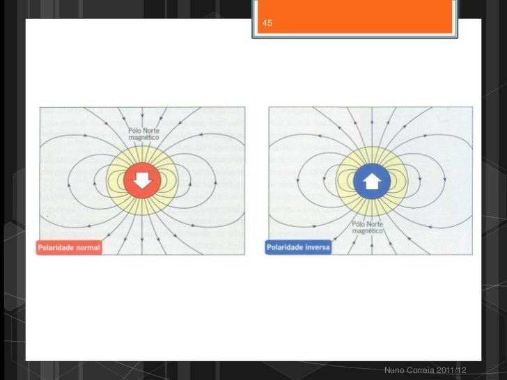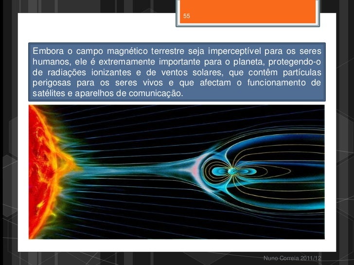 55. 55. 55Embora o campo magnético terrestre seja imperceptível para os sereshumanos, ele é extremamente importante para o planeta, protegendo-ode radiações ionizantes e de ventos solares, que contêm partículasperigosas para os seres vivos e que afectam o funcionamento desatélites e aparelhos de comunicação. Nuno Correia 2011/12