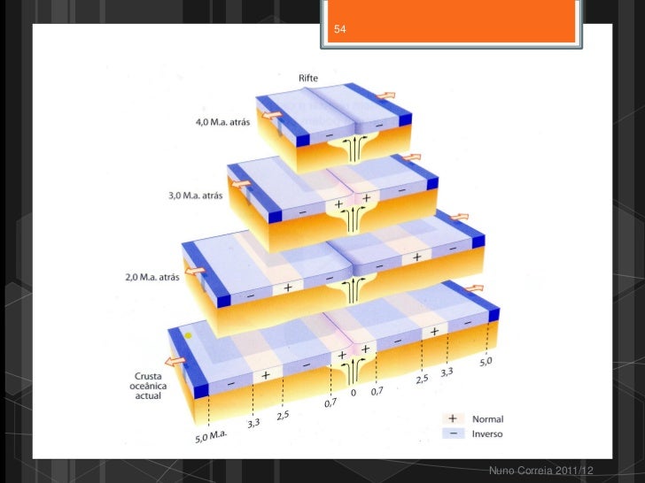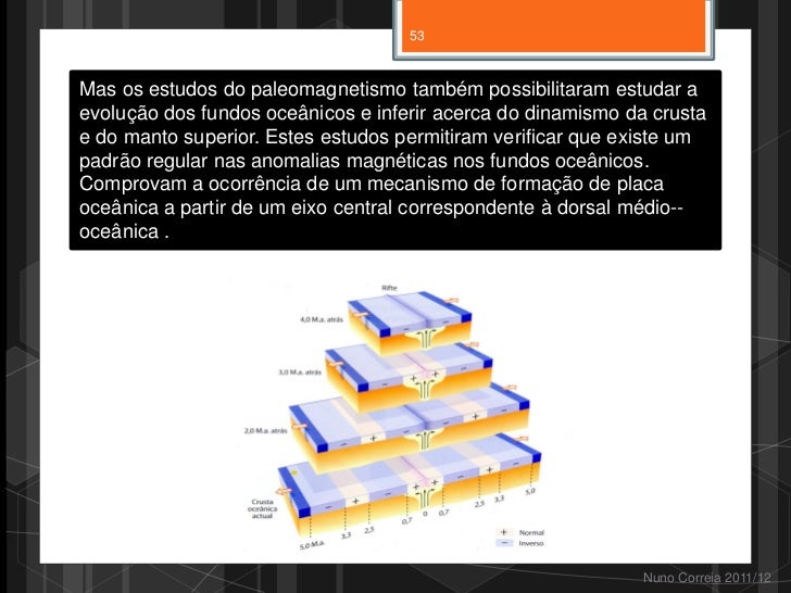 53. 53. 53Mas os estudos do paleomagnetismo também possibilitaram estudar aevolução dos fundos oceânicos e inferir acerca do dinamismo da crustae do manto superior. Estes estudos permitiram verificar que existe umpadrão regular nas anomalias magnéticas nos fundos oceânicos.Comprovam a ocorrência de um mecanismo de formação de placaoceânica a partir de um eixo central correspondente à dorsal médio--oceânica . Nuno Correia 2011/12