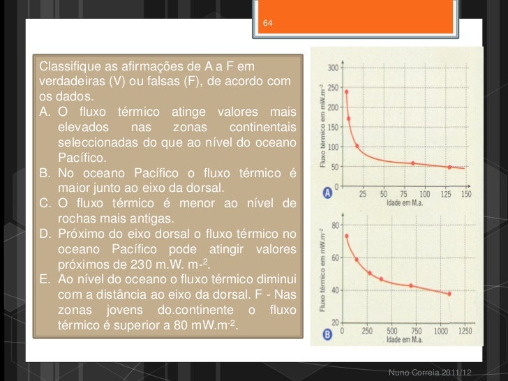64. 64. 64Classifique as afirmações de A a F emverdadeiras (V) ou falsas (F), de acordo comos dados.A. O fluxo térmico atinge valores mais elevados nas zonas continentais seleccionadas do que ao nível do oceano Pacífico.B. No oceano Pacífico o fluxo térmico é maior junto ao eixo da dorsal.C. O fluxo térmico é menor ao nível de rochas mais antigas.D. Próximo do eixo dorsal o fluxo térmico no oceano Pacífico pode atingir valores próximos de 230 m.W. m-2.E. Ao nível do oceano o fluxo térmico diminui com a distância ao eixo da dorsal. F - Nas zonas jovens do.continente o fluxo térmico é superior a 80 mW.m-2. Nuno Correia 2011/12