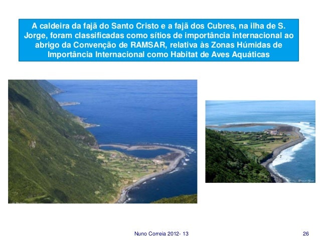 26. 26. Nuno Correia 2012- 13 26A caldeira da fajã do Santo Cristo e a fajã dos Cubres, na ilha de S.Jorge, foram classificadas como sítios de importância internacional aoabrigo da Convenção de RAMSAR, relativa às Zonas Húmidas deImportância Internacional como Habitat de Aves Aquáticas