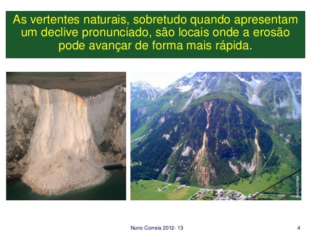 4. 4. Nuno Correia 2012- 13 4As vertentes naturais, sobretudo quando apresentamum declive pronunciado, são locais onde a erosãopode avançar de forma mais rápida.