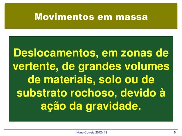 5. 5. Movimentos em massaDeslocamentos, em zonas devertente, de grandes volumesde materiais, solo ou desubstrato rochoso, devido àação da gravidade.Nuno Correia 2012- 13 5