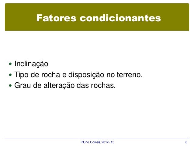 Fatores condicionantes Inclinação Tipo de rocha e disposição no terreno. Grau de alteração das rochas.Nuno Correia 2012...