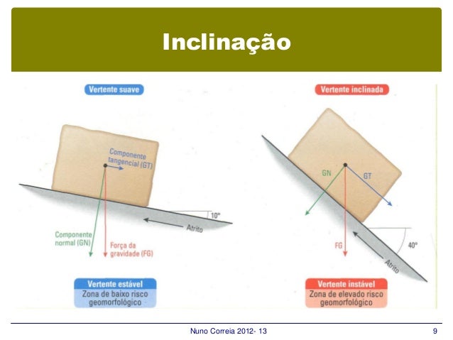 8. 8. Fatores condicionantes Inclinação Tipo de rocha e disposição no terreno. Grau de alteração das rochas.Nuno Correia 2012- 13 8