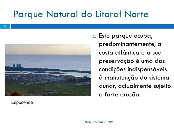 11. 11. Parque Natural do Litoral Norte 11  Este parque ocupa, predominantemente, a costa atlântica e a sua preservação é uma das condições indispensáveis à manutenção do sistema dunar, actualmente sujeito a forte erosão. Esposende Nuno Correia 08/09