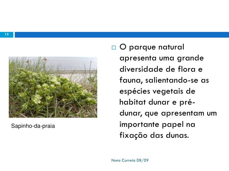 12. 12. 12  O parque natural apresenta uma grande diversidade de flora e fauna, salientando-se as espécies vegetais de habitat dunar e pré- dunar, que apresentam um Sapinho-da-praia importante papel na fixação das dunas. Nuno Correia 08/09