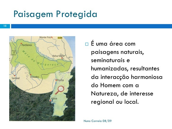15. 15. Paisagem Protegida 15  É uma área com paisagens naturais, seminaturais e humanizadas, resultantes da interacção harmoniosa do Homem com a Natureza, de interesse regional ou local. Nuno Correia 08/09