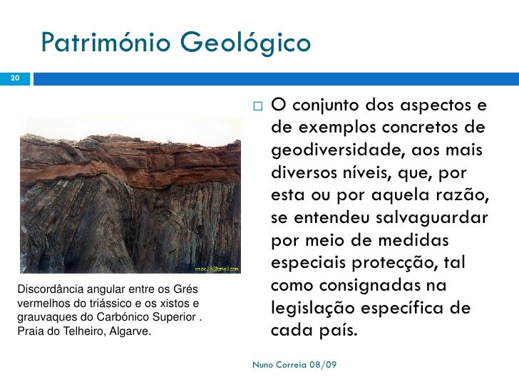 20. 20. Património Geológico 20  O conjunto dos aspectos e de exemplos concretos de geodiversidade, aos mais diversos níveis, que, por esta ou por aquela razão, se entendeu salvaguardar por meio de medidas especiais protecção, tal Discordância angular entre os Grés como consignadas na vermelhos do triássico e os xistos e grauvaques do Carbónico Superior . legislação específica de Praia do Telheiro, Algarve. cada país. Nuno Correia 08/09