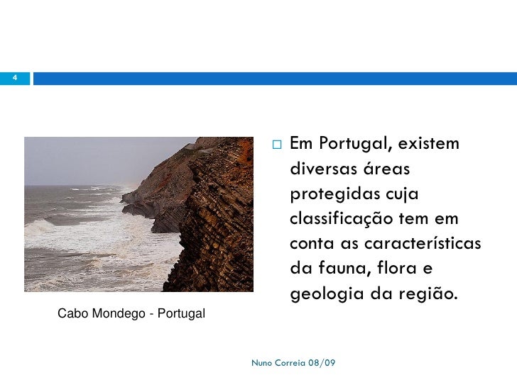 4. 4. 4  Em Portugal, existem diversas áreas protegidas cuja classificação tem em conta as características da fauna, flora e geologia da região. Cabo Mondego - Portugal Nuno Correia 08/09
