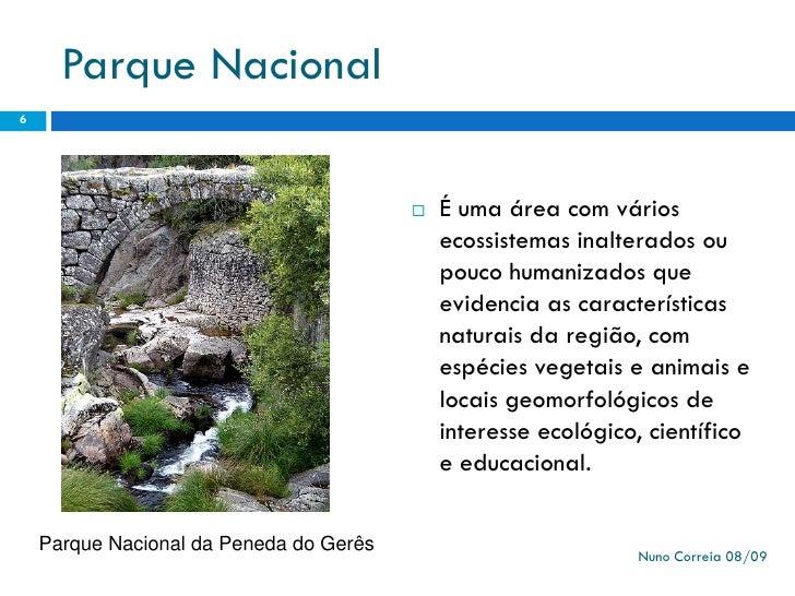 6. 6. Parque Nacional 6  É uma área com vários ecossistemas inalterados ou pouco humanizados que evidencia as características naturais da região, com espécies vegetais e animais e locais geomorfológicos de interesse ecológico, científico e educacional. Parque Nacional da Peneda do Gerês Nuno Correia 08/09