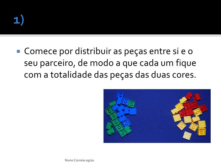 10. 10.  Comece por distribuir as peças entre si e o seu parceiro, de modo a que cada um fique com a totalidade das peças das duas cores. Nuno Correia 09/10