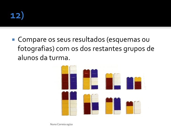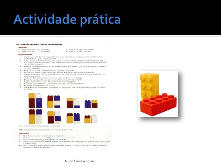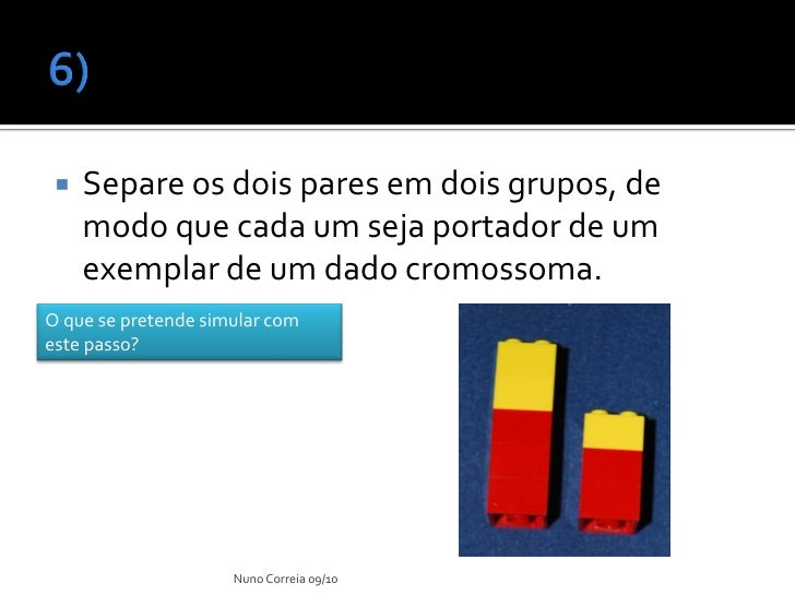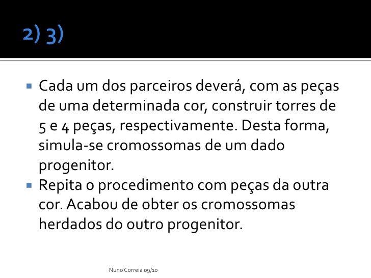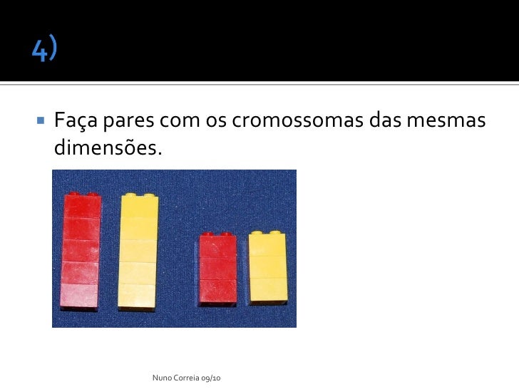 11. 11.  Cada um dos parceiros deverá, com as peças de uma determinada cor, construir torres de 5 e 4 peças, respectivamente. Desta forma, simula-se cromossomas de um dado progenitor.  Repita o procedimento com peças da outra cor. Acabou de obter os cromossomas herdados do outro progenitor. Nuno Correia 09/10
