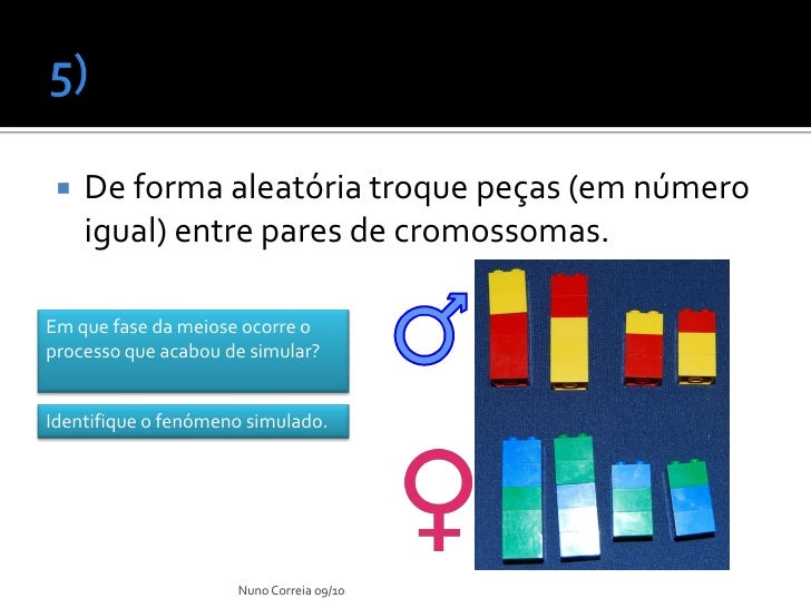 13. 13.  De forma aleatória troque peças (em número igual) entre pares de cromossomas. Em que fase da meiose ocorre o processo que acabou de simular? Identifique o fenómeno simulado. Nuno Correia 09/10