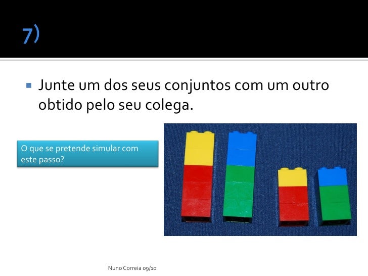 15. 15.  Junte um dos seus conjuntos com um outro obtido pelo seu colega. O que se pretende simular com este passo? Nuno Correia 09/10