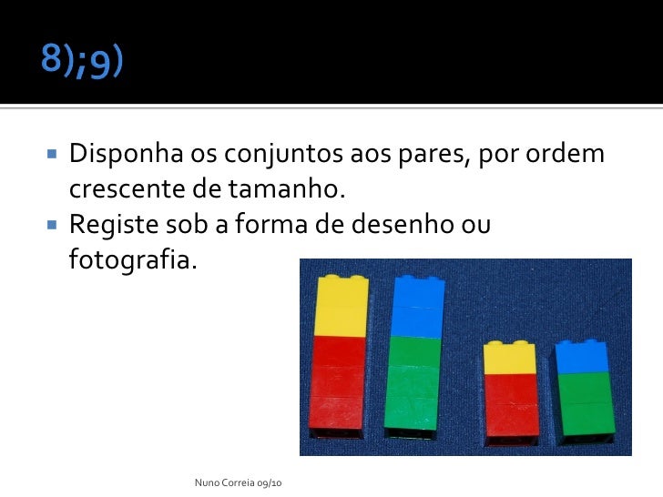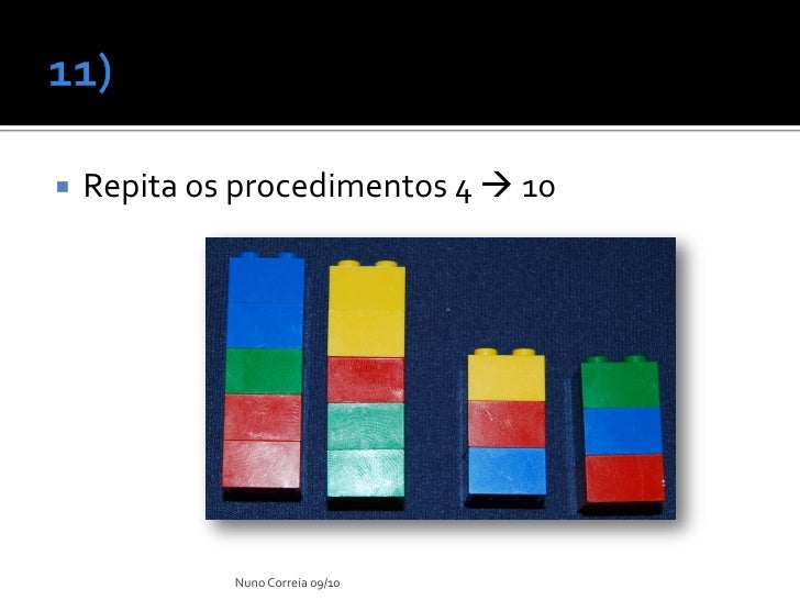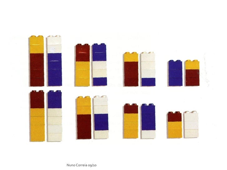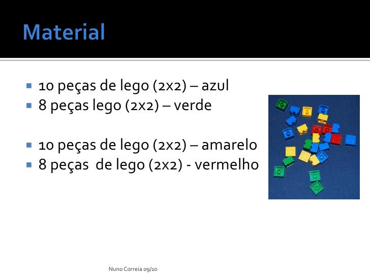 8. 8.  10 peças de lego (2x2) – azul  8 peças lego (2x2) – verde  10 peças de lego (2x2) – amarelo  8 peças de lego (2x2) - vermelho Nuno Correia 09/10