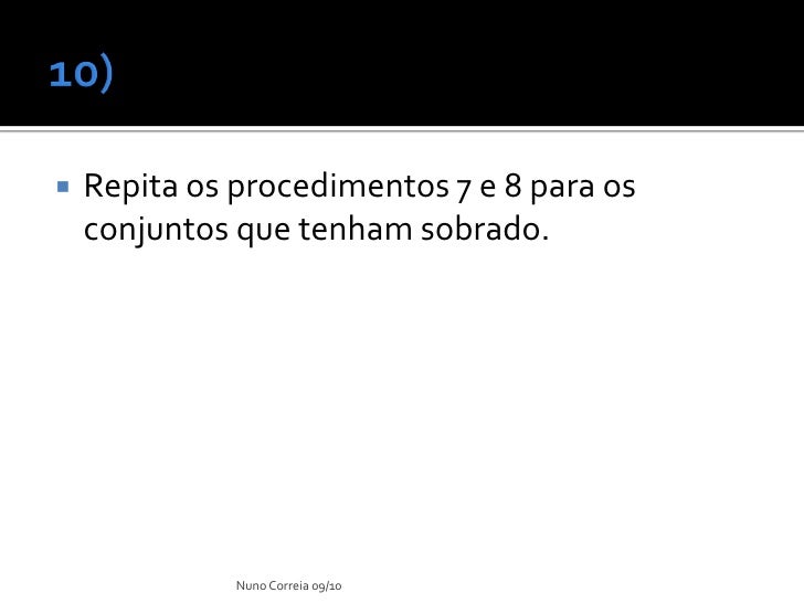 18. 18.  Repita os procedimentos 7 e 8 para os conjuntos que tenham sobrado. Nuno Correia 09/10