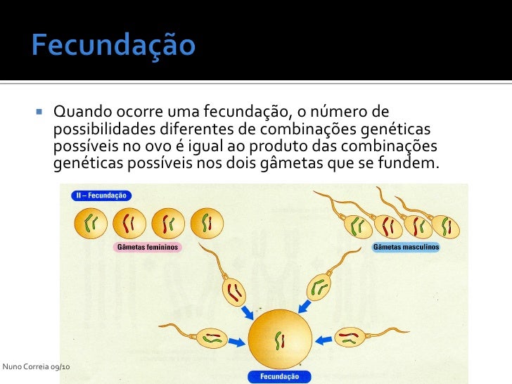 23. 23.  Quando ocorre uma fecundação, o número de possibilidades diferentes de combinações genéticas possíveis no ovo é igual ao produto das combinações genéticas possíveis nos dois gâmetas que se fundem. Nuno Correia 09/10
