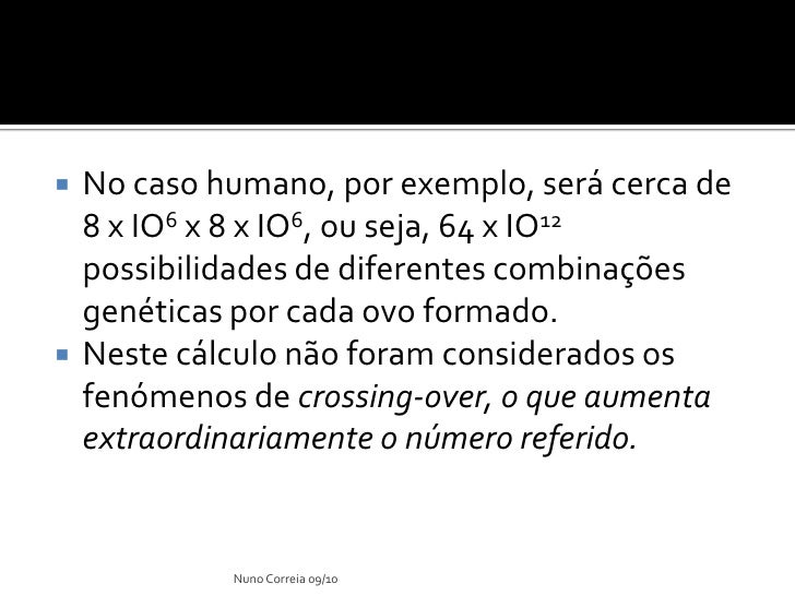 24. 24.  No caso humano, por exemplo, será cerca de 8 x IO6 x 8 x IO6, ou seja, 64 x IO12 possibilidades de diferentes combinações genéticas por cada ovo formado.  Neste cálculo não foram considerados os fenómenos de crossing-over, o que aumenta extraordinariamente o número referido. Nuno Correia 09/10