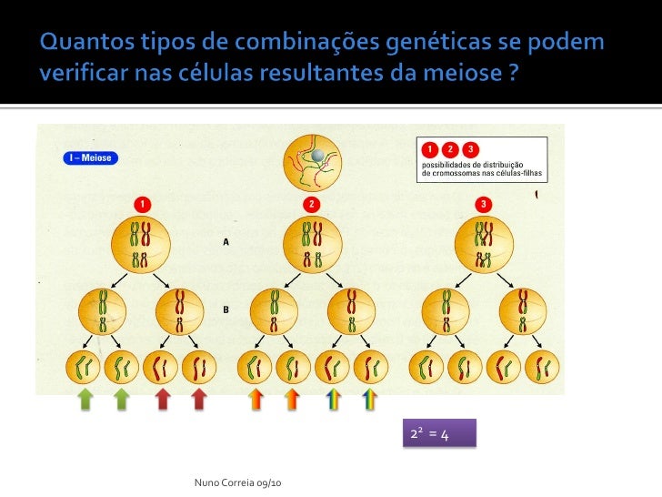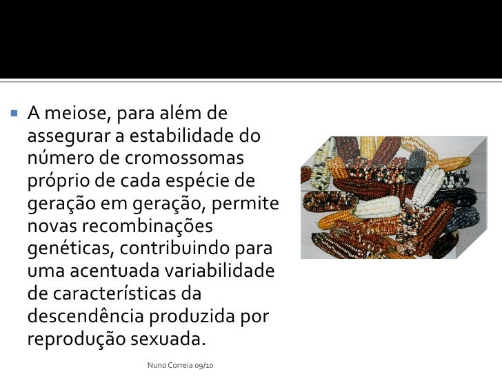 6. 6.  A meiose, para além de assegurar a estabilidade do número de cromossomas próprio de cada espécie de geração em geração, permite novas recombinações genéticas, contribuindo para uma acentuada variabilidade de características da descendência produzida por reprodução sexuada. Nuno Correia 09/10