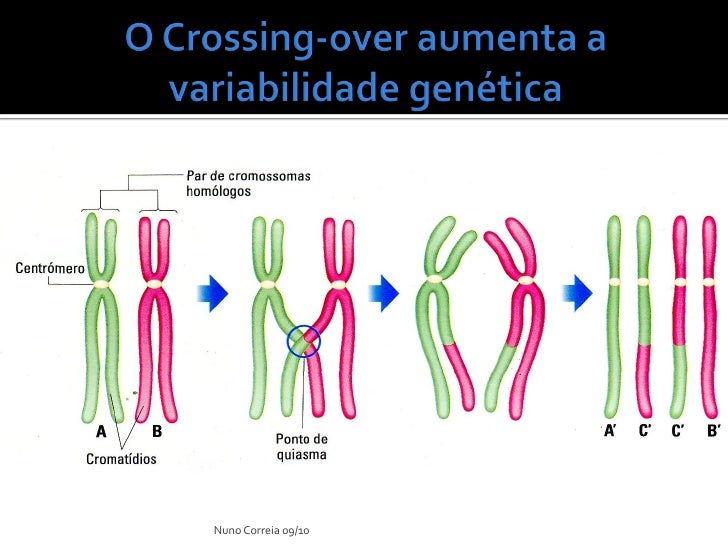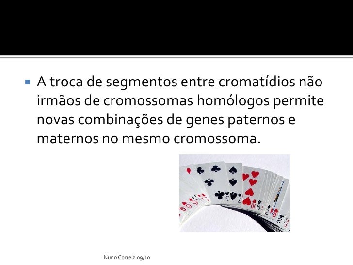 5. 5.  A troca de segmentos entre cromatídios não irmãos de cromossomas homólogos permite novas combinações de genes paternos e maternos no mesmo cromossoma. Nuno Correia 09/10