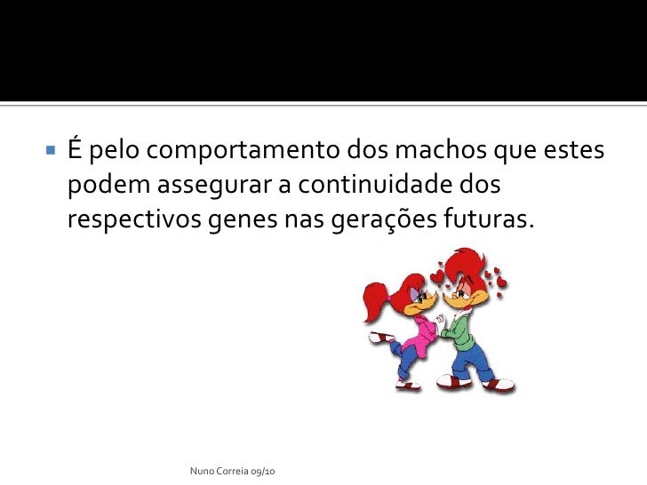 10. 10.  É pelo comportamento dos machos que estes podem assegurar a continuidade dos respectivos genes nas gerações futuras. Nuno Correia 09/10