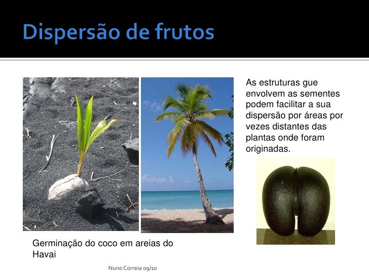 23. 23. As estruturas gue envolvem as sementes podem facilitar a sua dispersão por áreas por vezes distantes das plantas onde foram originadas. Germinação do coco em areias do Havai Nuno Correia 09/10