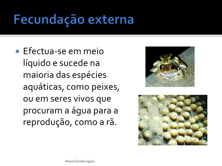 7. 7.  Efectua-se em meio líquido e sucede na maioria das espécies aquáticas, como peixes, ou em seres vivos que procuram a água para a reprodução, como a rã. Nuno Correia 09/10