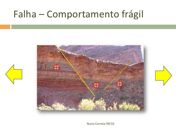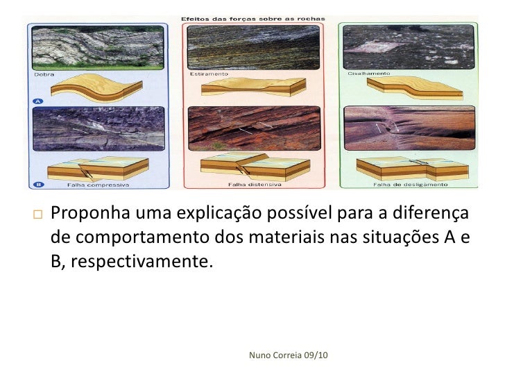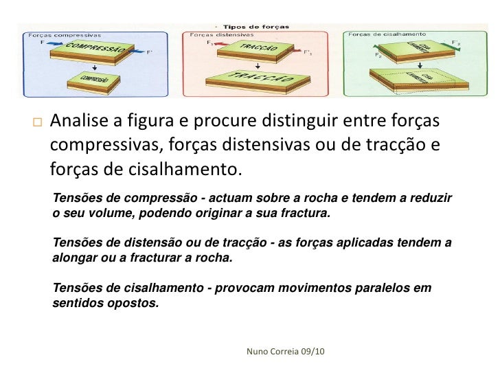 11. 11.  Analise a figura e procure distinguir entre forças compressivas, forças distensivas ou de tracção e forças de cisalhamento. Tensões de compressão - actuam sobre a rocha e tendem a reduzir o seu volume, podendo originar a sua fractura. Tensões de distensão ou de tracção - as forças aplicadas tendem a alongar ou a fracturar a rocha. Tensões de cisalhamento - provocam movimentos paralelos em sentidos opostos. Nuno Correia 09/10