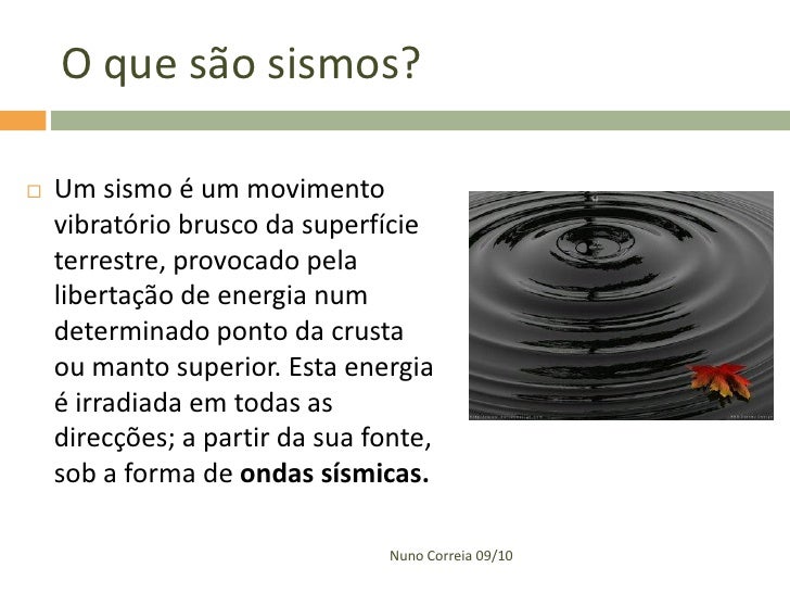 2. 2. O que são sismos?  Um sismo é um movimento vibratório brusco da superfície terrestre, provocado pela libertação de energia num determinado ponto da crusta ou manto superior. Esta energia é irradiada em todas as direcções; a partir da sua fonte, sob a forma de ondas sísmicas. Nuno Correia 09/10