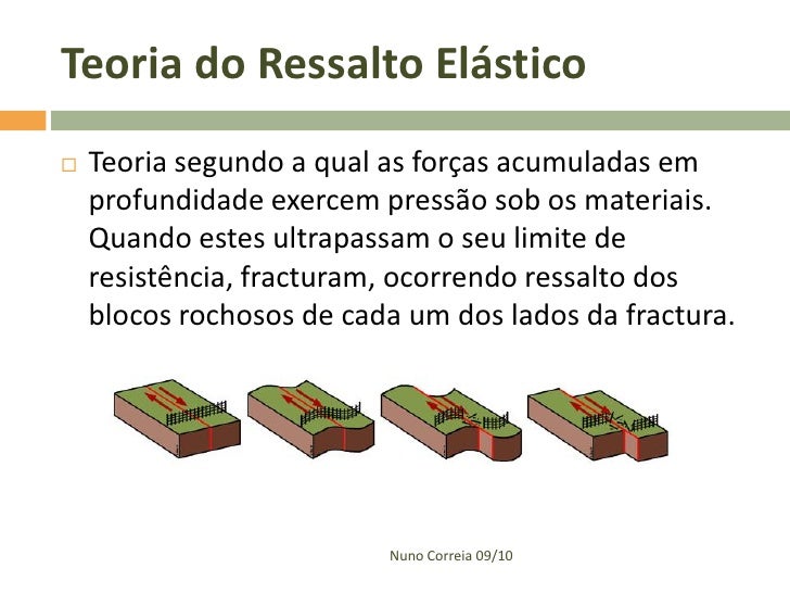 22. 22. Teoria do Ressalto Elástico  Teoria segundo a qual as forças acumuladas em profundidade exercem pressão sob os materiais. Quando estes ultrapassam o seu limite de resistência, fracturam, ocorrendo ressalto dos blocos rochosos de cada um dos lados da fractura. Nuno Correia 09/10