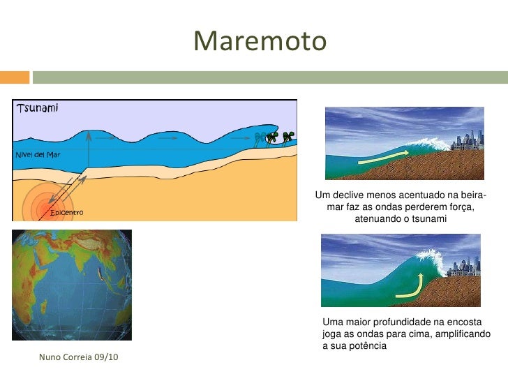 25. 25. Maremoto Um declive menos acentuado na beira- mar faz as ondas perderem força, atenuando o tsunami Uma maior profundidade na encosta joga as ondas para cima, amplificando a sua potência Nuno Correia 09/10