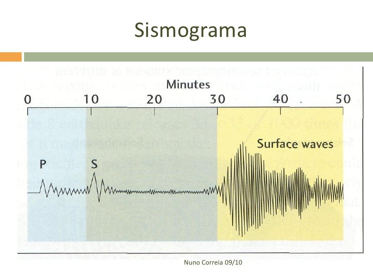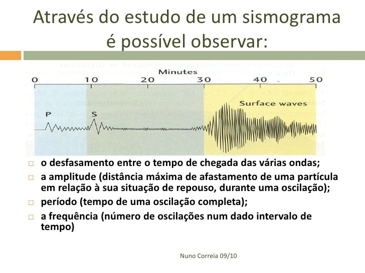 37. 37. Através do estudo de um sismograma é possível observar:  o desfasamento entre o tempo de chegada das várias ondas;  a amplitude (distância máxima de afastamento de uma partícula em relação à sua situação de repouso, durante uma oscilação);  período (tempo de uma oscilação completa);  a frequência (número de oscilações num dado intervalo de tempo) Nuno Correia 09/10