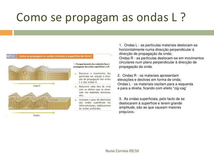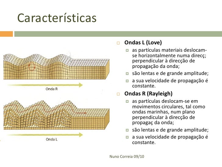 34. 34. Características  Ondas L (Love)  as partículas materiais deslocam- se horizontalmente numa direcç; perpendicular à direcção de propagação da onda;  são lentas e de grande amplitude;  a sua velocidade de propagação é constante.  Ondas R (Rayleigh)  as partículas deslocam-se em movimentos circulares, tal como ondas marinhas, num plano perpendicular à direcção de propagaç da onda;  são lentas e de grande amplitude;  a sua velocidade de propagação é constante. Nuno Correia 09/10