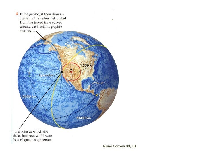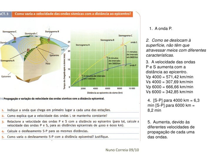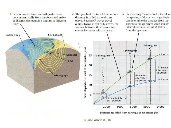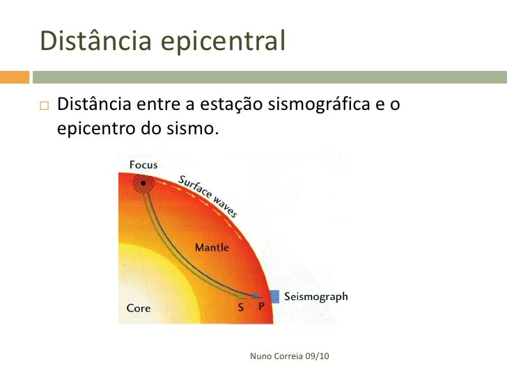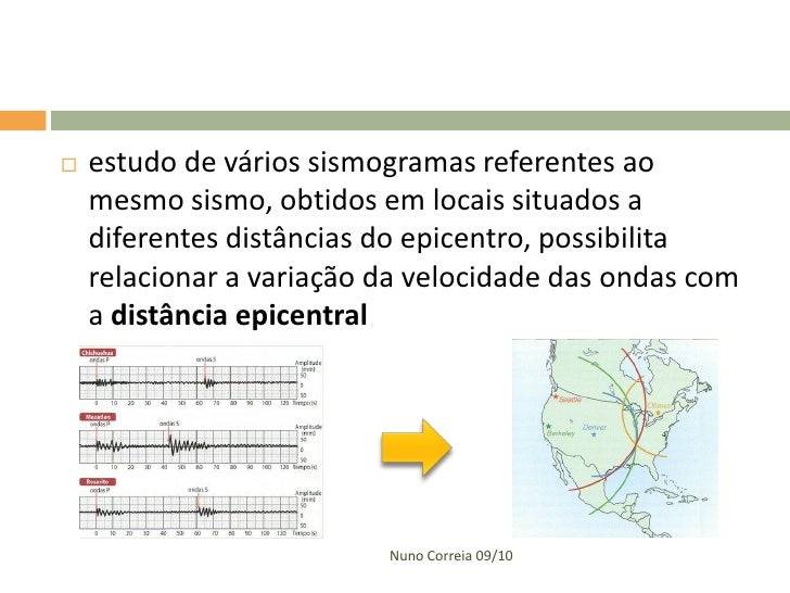 39. 39.  estudo de vários sismogramas referentes ao mesmo sismo, obtidos em locais situados a diferentes distâncias do epicentro, possibilita relacionar a variação da velocidade das ondas com a distância epicentral Nuno Correia 09/10