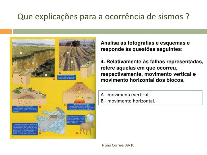 8. 8. Que explicações para a ocorrência de sismos ? Analisa as fotografias e esquemas e responde às questões seguintes: 4. Relativamente às falhas representadas, refere aquelas em que ocorreu, respectivamente, movimento vertical e movimento horizontal dos blocos. A - movimento vertical; B - movimento horizontal. Nuno Correia 09/10
