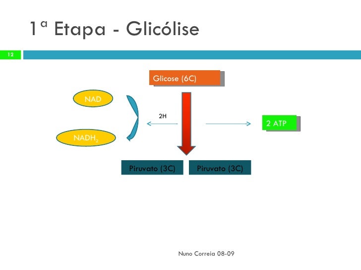 12. 12. 1ª Etapa - Glicólise Nuno Correia 08-09 Glicose (6C) Piruvato (3C) Piruvato (3C) 2 ATP NAD NADH 2 2H