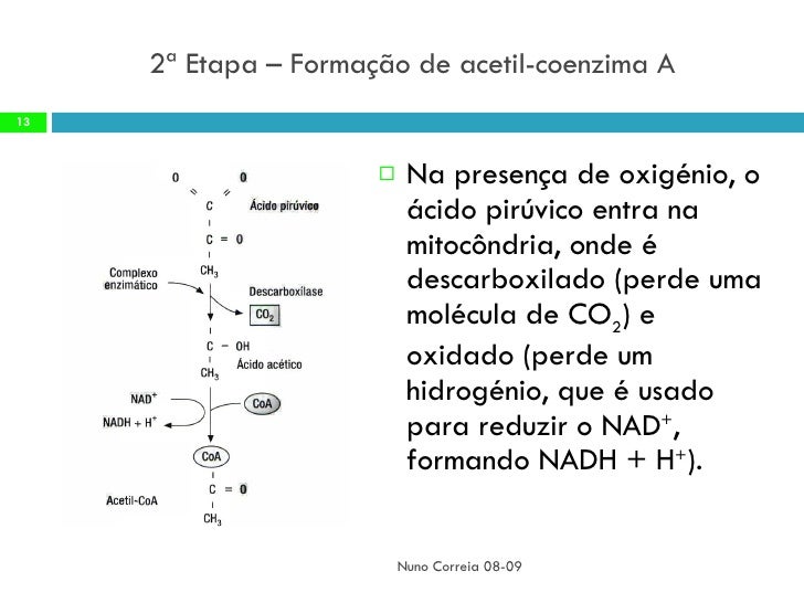 13. 13. 2ª Etapa – Formação de acetil-coenzima A <ul><li>Na presença de oxigénio, o ácido pirúvico entra na mitocôndria, onde é descarboxilado (perde uma molécula de CO 2 ) e oxidado (perde um hidrogénio, que é usado para reduzir o NAD + , formando NADH + H + ). </li></ul>Nuno Correia 08-09