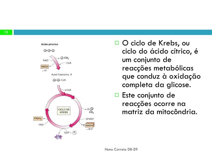 15. 15. <ul><li>O ciclo de Krebs, ou ciclo do ácido cítrico, é um conjunto de reacções metabólicas que conduz à oxidação completa da glicose. </li></ul><ul><li>Este conjunto de reacções ocorre na matriz da mitocôndria. </li></ul>Nuno Correia 08-09