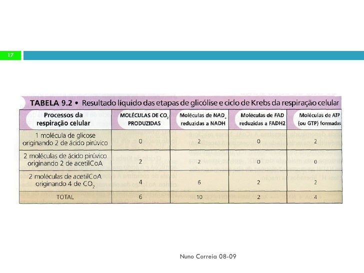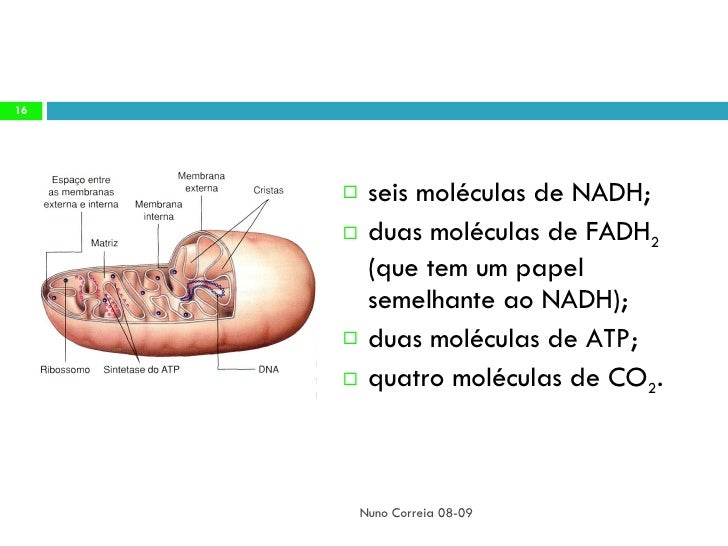16. 16. <ul><li>seis moléculas de NADH; </li></ul><ul><li>duas moléculas de FADH 2 (que tem um papel semelhante ao NADH); </li></ul><ul><li>duas moléculas de ATP; </li></ul><ul><li>quatro moléculas de CO 2 . </li></ul>Nuno Correia 08-09
