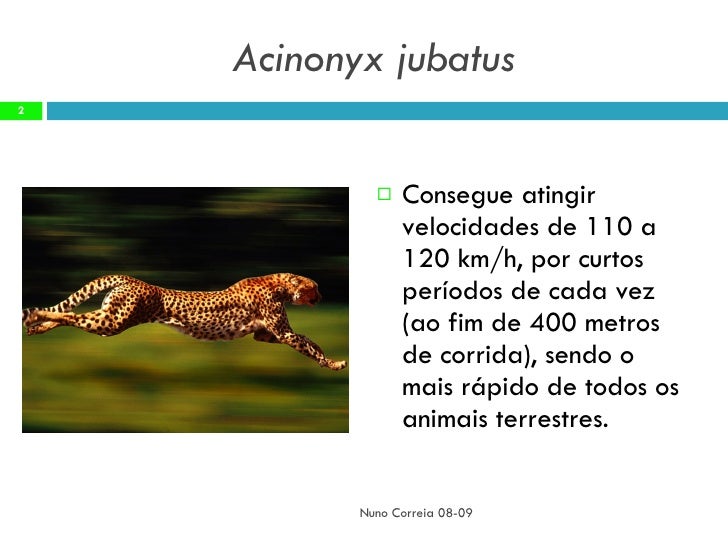 2. 2. Acinonyx jubatus <ul><li>Consegue atingir velocidades de 110 a 120 km/h, por curtos períodos de cada vez (ao fim de 400 metros de corrida), sendo o mais rápido de todos os animais terrestres. </li></ul>Nuno Correia 08-09