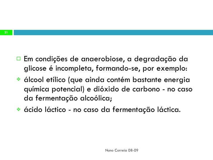 21. 21. <ul><li>Em condições de anaerobiose, a degradação da glicose é incompleta, formando-se, por exemplo: </li></ul><ul><li>álcool etílico (que ainda contém bastante energia química potencial) e dióxido de carbono - no caso da fermentação alcoólica; </li></ul><ul><li>ácido láctico - no caso da fermentação láctica. </li></ul>Nuno Correia 08-09