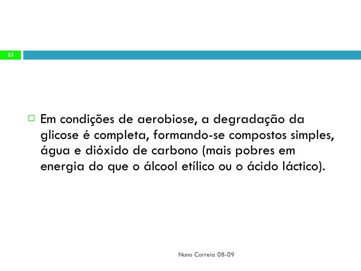 23. 23. <ul><li>Em condições de aerobiose, a degradação da glicose é completa, formando-se compostos simples, água e dióxido de carbono (mais pobres em energia do que o álcool etílico ou o ácido láctico). </li></ul>Nuno Correia 08-09
