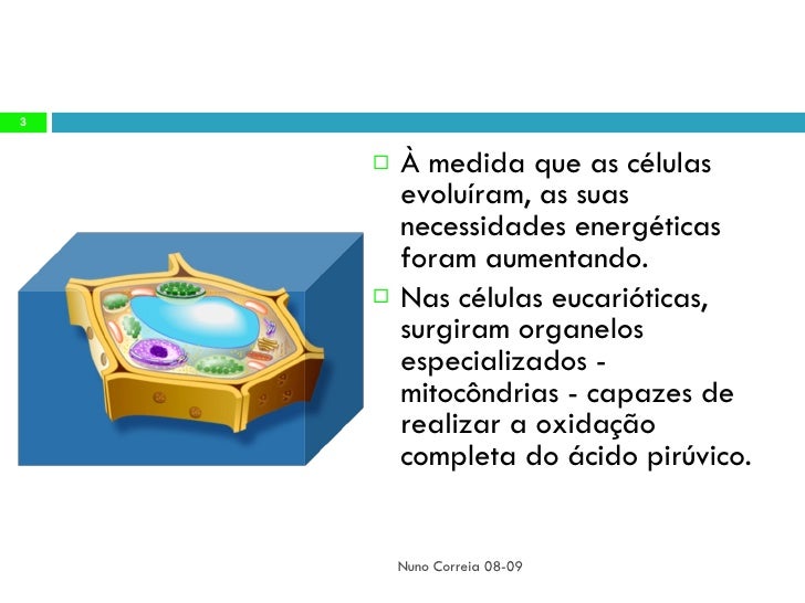 3. 3. <ul><li>À medida que as células evoluíram, as suas necessidades energéticas foram aumentando. </li></ul><ul><li>Nas células eucarióticas, surgiram organelos especializados - mitocôndrias - capazes de realizar a oxidação completa do ácido pirúvico. </li></ul>Nuno Correia 08-09