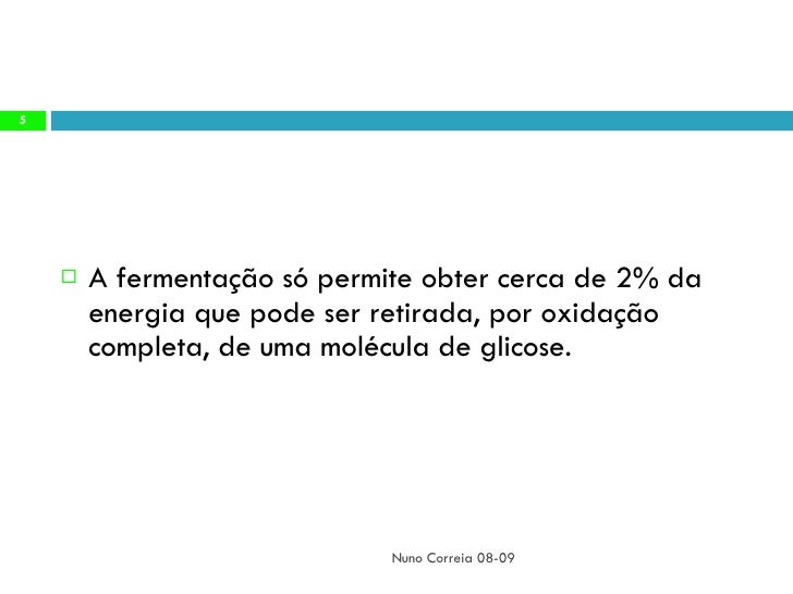 5. 5. <ul><li>A fermentação só permite obter cerca de 2% da energia que pode ser retirada, por oxidação completa, de uma molécula de glicose. </li></ul>Nuno Correia 08-09