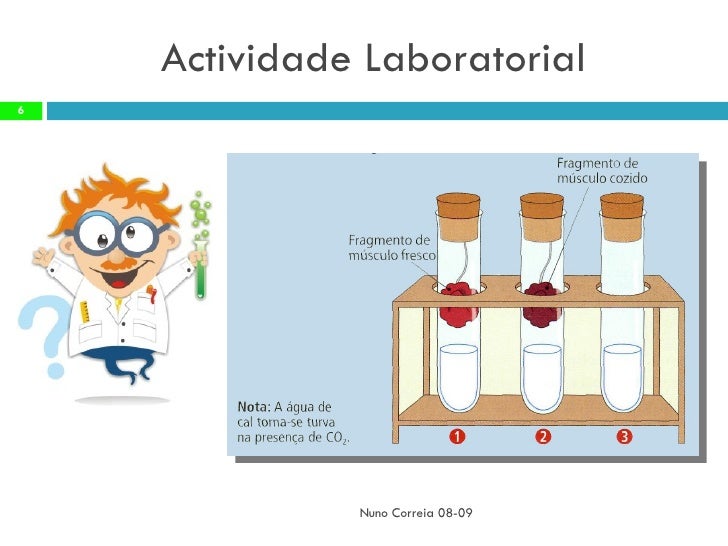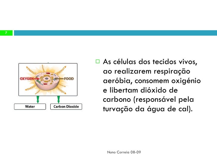 7. 7. <ul><li>As células dos tecidos vivos, ao realizarem respiração aeróbia, consomem oxigénio e libertam dióxido de carbono (responsável pela turvação da água de cal). </li></ul>Nuno Correia 08-09