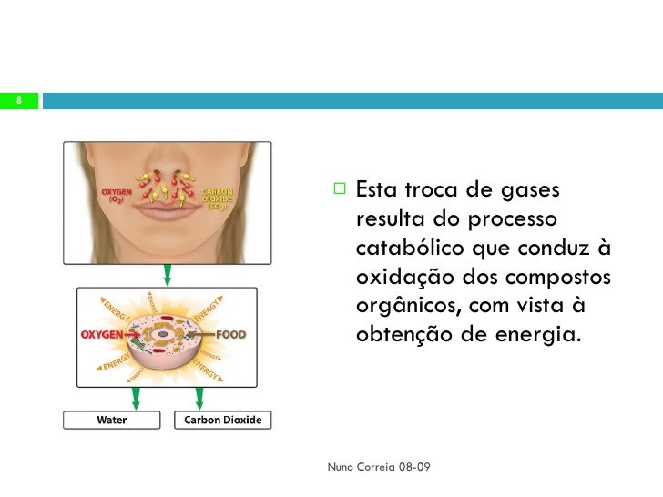 8. 8. <ul><li>Esta troca de gases resulta do processo catabólico que conduz à oxidação dos compostos orgânicos, com vista à obtenção de energia. </li></ul>Nuno Correia 08-09