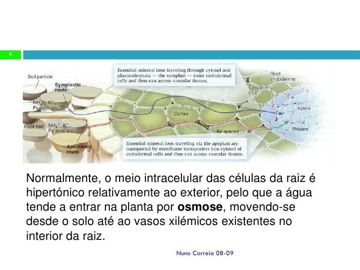 4. 4. 4 Normalmente, o meio intracelular das células da raiz é hipertónico relativamente ao exterior, pelo que a água tende a entrar na planta por osmose, movendo-se desde o solo até ao vasos xilémicos existentes no interior da raiz. Nuno Correia 08-09