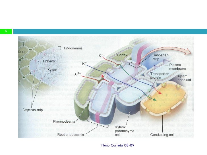 6. 6. 6 Os iões minerais, quando presentes no solo em  concentrações elevadas entram na raiz por difusão simples. No entanto, é usual verificar-se uma elevada  concentração destes iões no meio intracelular. Neste caso, os iões entram para as células por transporte activo, com consequente gasto de energia. O transporte activo destes iões através das células da  periferia da raiz até ao xilema cria um gradiente osmótico, que faz com que a água tenda a passar por osmose até ao xilema. Nuno Correia 08-09